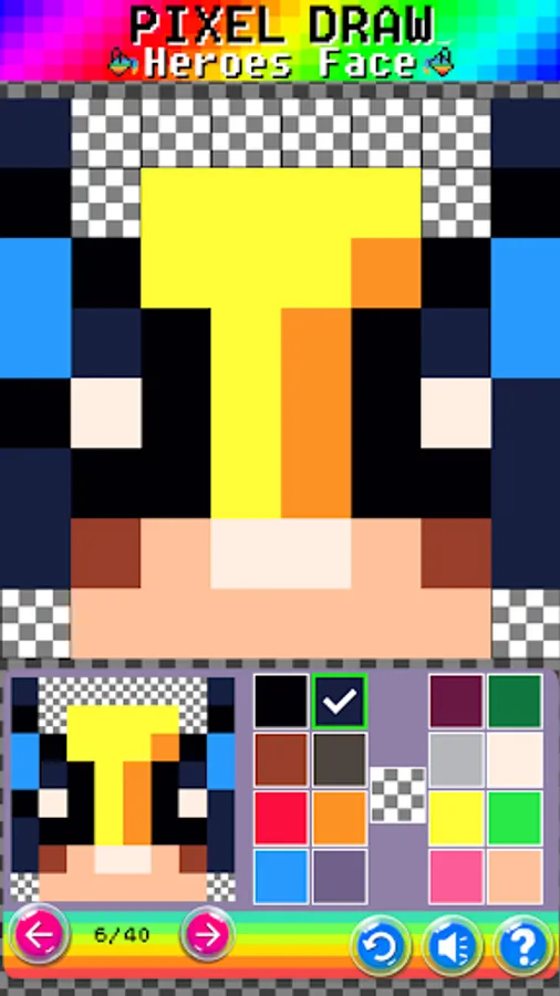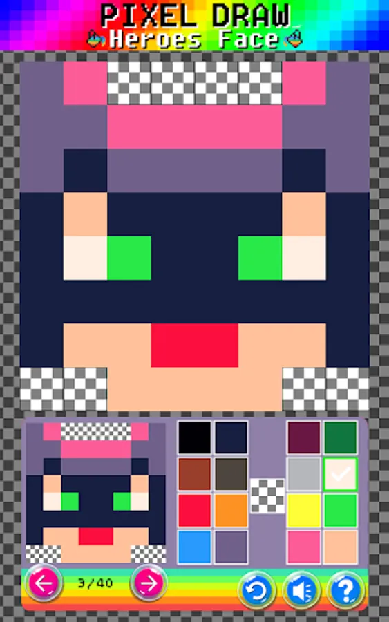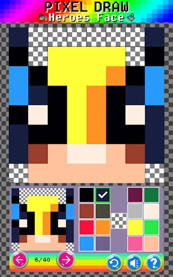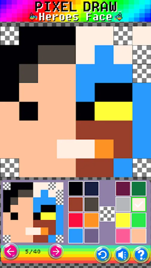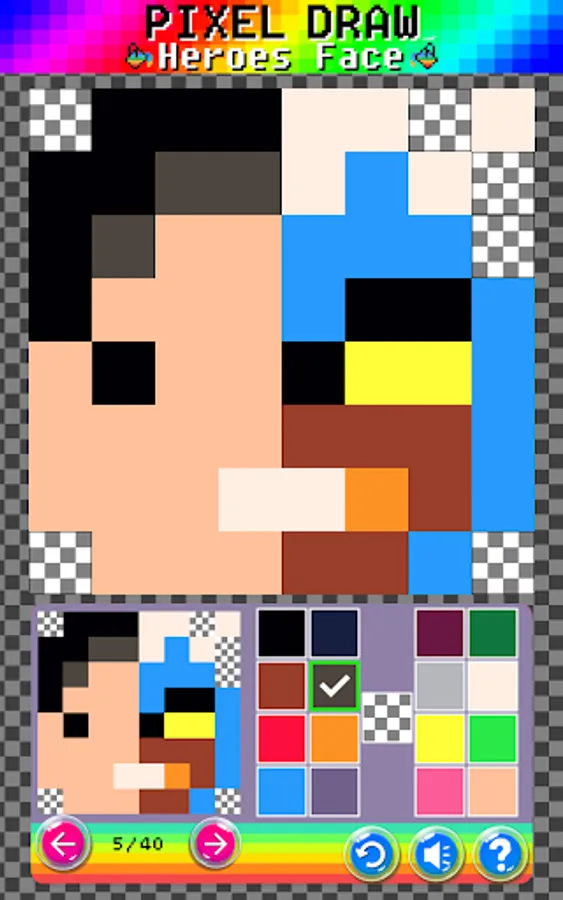 The puzzle game per pixel, consists of a box where you have to place the pixel of the selected color and get the hero image just like the hero image shown in the lower left corner.