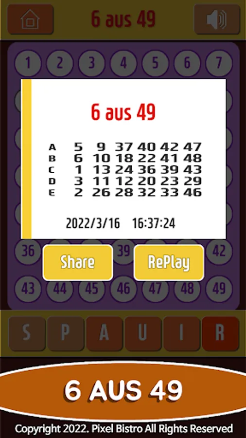 Loto : Pick five numbers (1-49) plus one Chance Ball (1-10)