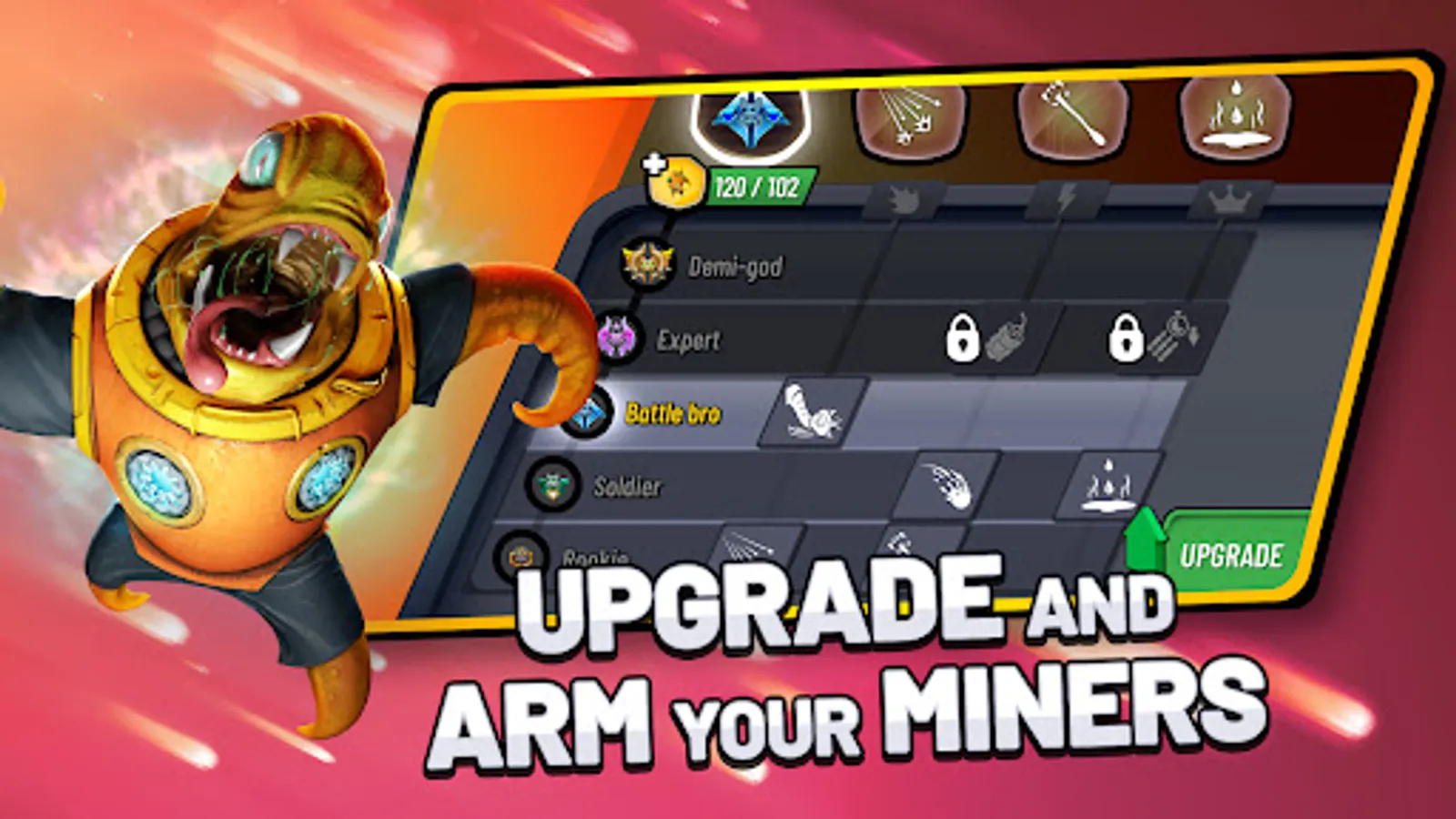 - Choose a crystal miner with the fiercest weapons