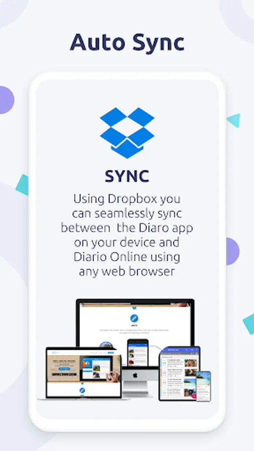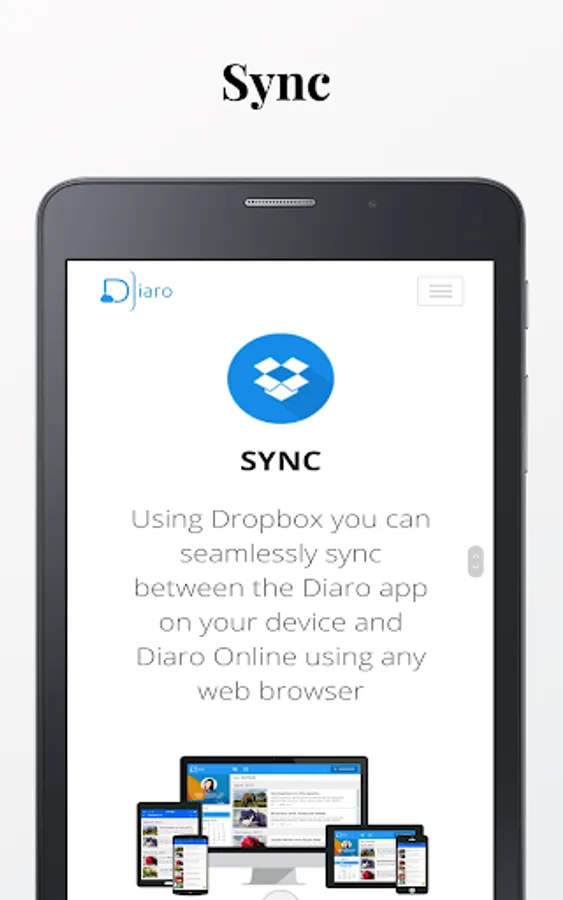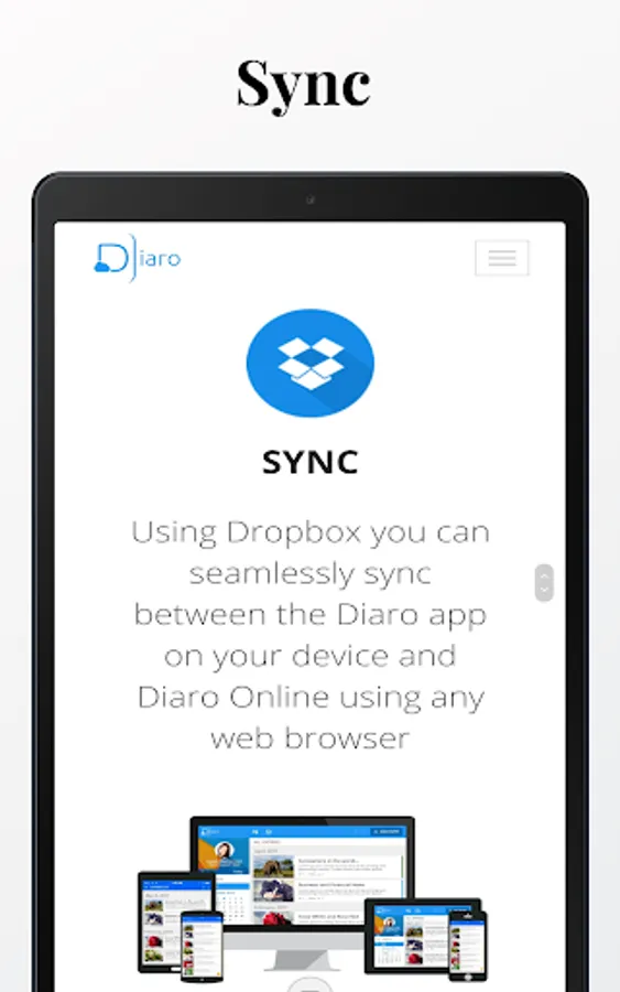 Diaro is truly multi-platform. Using Dropbox you can seamlessly sync between the Diaro app on all of your devices & Diaro Online using any web browser at diaroapp.com