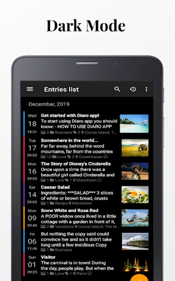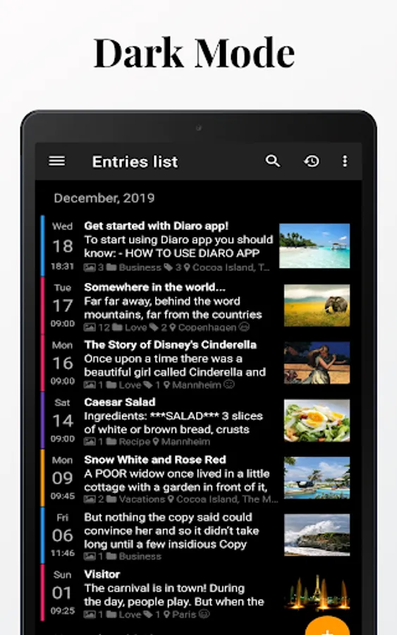 Powerful search & filter functions. Organize diary/ journal entries using folders, tags, locations & find records by keyword, filter them by date, tags, folder or even location