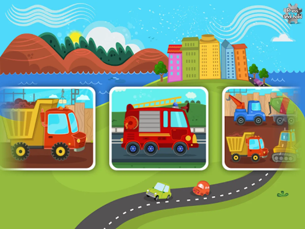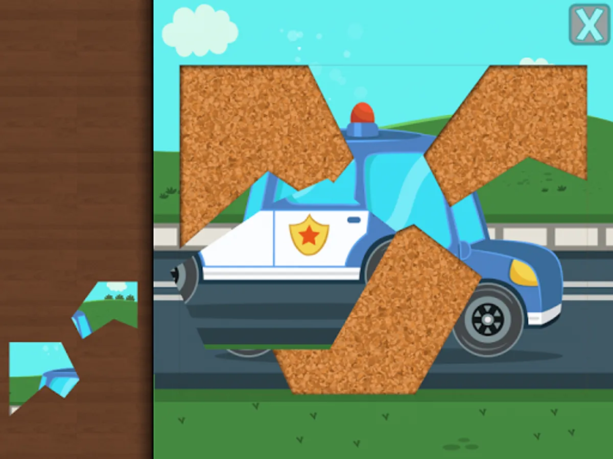 A fun puzzle game for toddlers and kids from ages 1 to 6 featuring 16 cartoon cars and construction vehicles such as race car, police car, tractor, fire engine, ambulance, garbage truck, bulldozer and more in 20 shape & tangram puzzles!