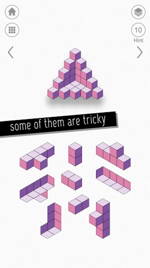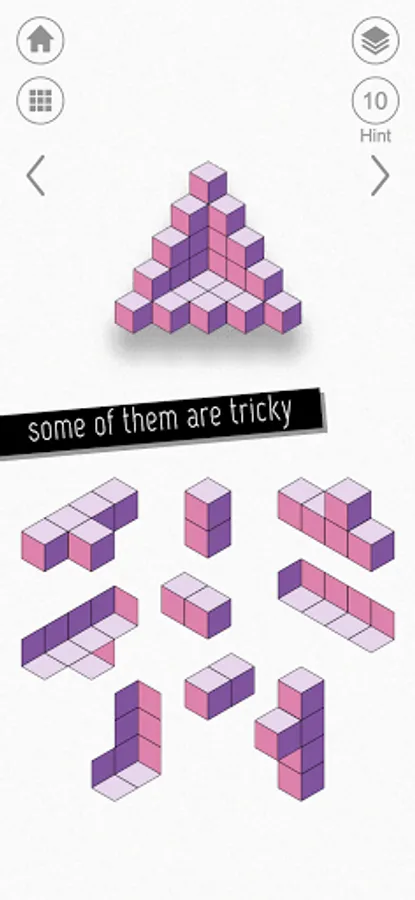 kubic is a unique minimalist puzzle game based on M.C. Escher's art, impossible objects and other geometric designs. The object is to construct the goal configuration from a number of pieces.