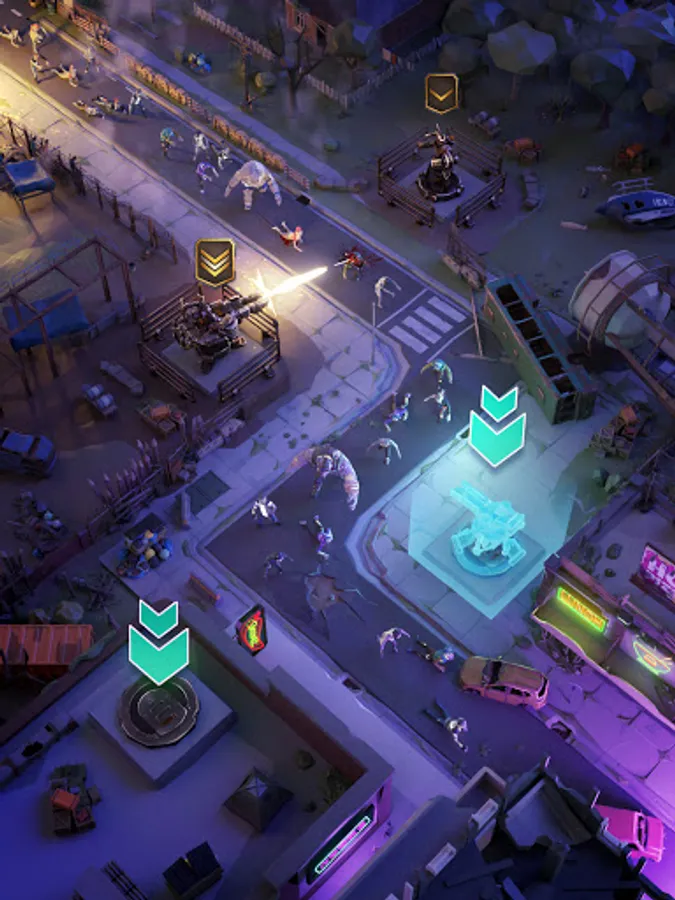 - Buy, sell and upgrade gun turrets, lasers, tesla coils and flamethrowers