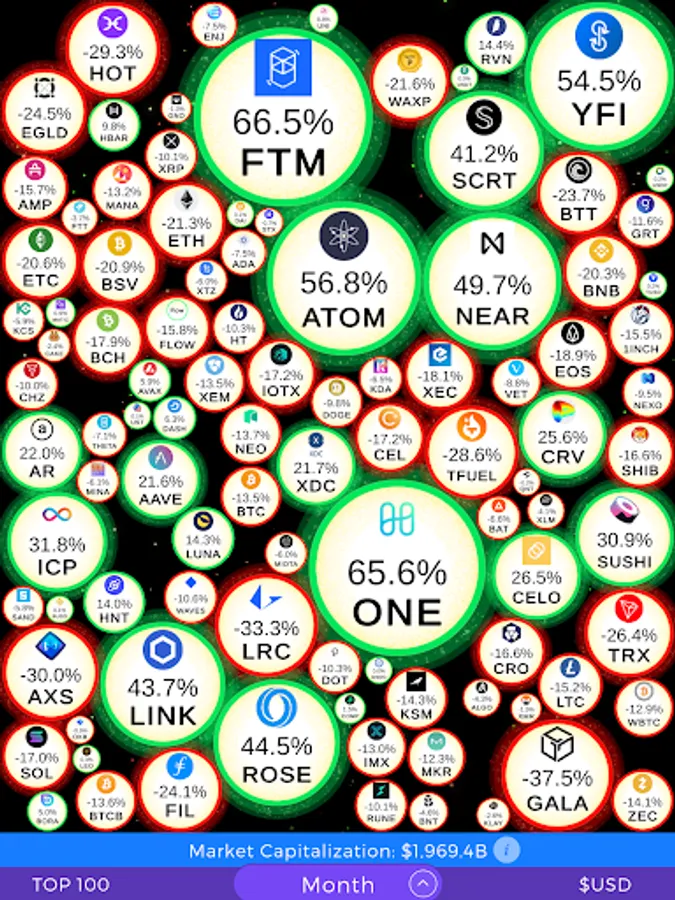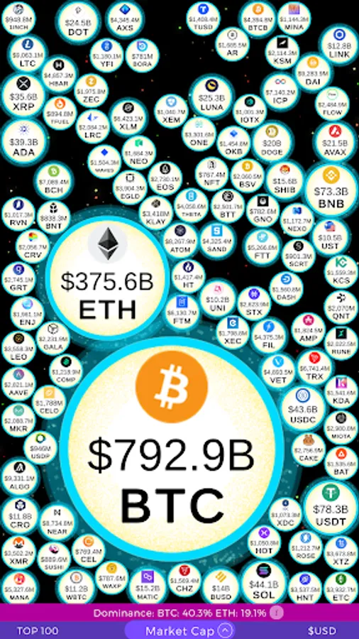 Compare crypto bubbles based on their volume over 24 hours in the market. Compare crypto performance and track crypto price changes as well as get a good feeling of the market cap and volume. The app uses live data of the underlying crypto assets, so you can watch the best crypto coins trends almost in real time: BTC (Bitcoin), ETH (Ethereum), ADA (Cardano), BNB (Binance Coin), CRO (Crypto.com) and more.