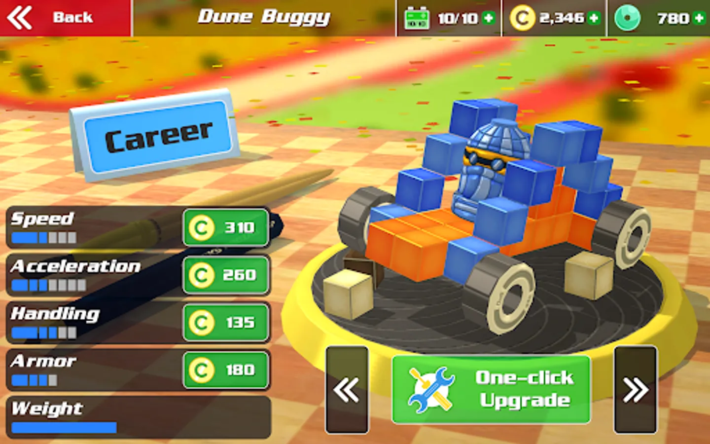 Upgrade race car stats to increase performance and voxel destruction prototype survivability to win pixel games.