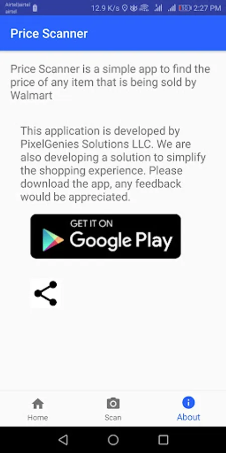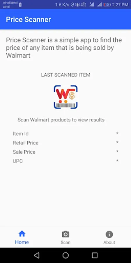 This app lets the user to scan the Walmart product to find its price. Scan the product and relevant details will be displayed on the screen.