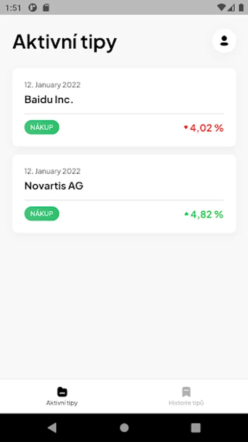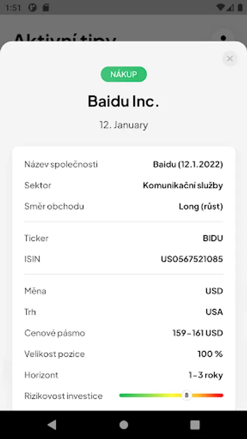 Active tips - All investments that are attractive from our point of view are displayed in the Active tips section. The detail of each recommended share also includes our preferred parameters on how to complete the transaction and the reasons why the investment should develop in the expected direction.
