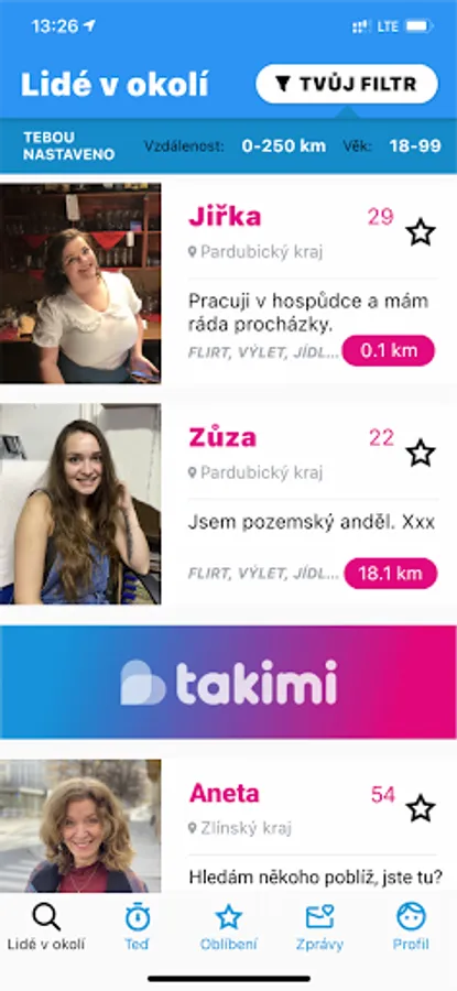 Takimi is the first Czech dating application that will help you muster the courage to be addressed for the first time. You can reach anyone who moves in your near and far surroundings. All you need is a smart cell phone.