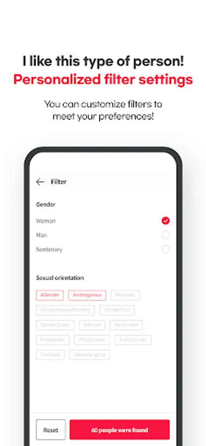 · You can select the gender of the person you want to meet with a custom filter.