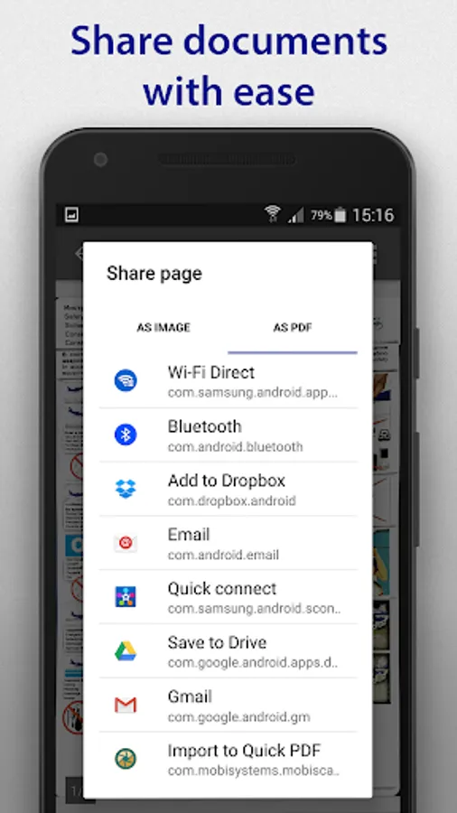 Send documents as PDF and image on the go. We use the standard Android system interface, so you can easily share files via any service convenient to you: