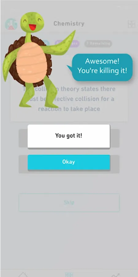 Ace features a parent portal, where parents can sign up and login, allowing them the ability to monitor their child’s progress, as well as add and assign subscription packages to students. Students can also track their progress in-app on the dashboard and on the progress page. The app features a marine mascot and study buddy “Ace” that will guide students while they study, praising them when questions are answered correctly and encouraging them when they get questions wrong.