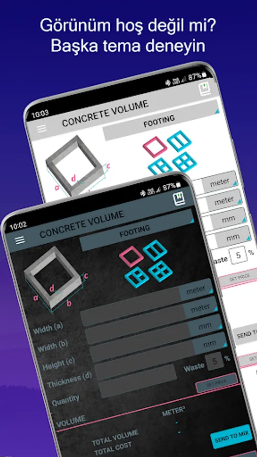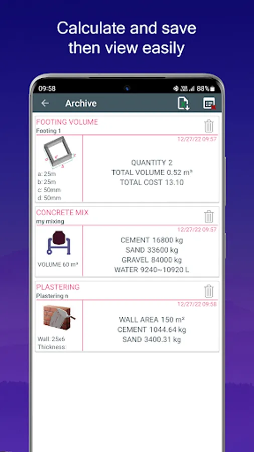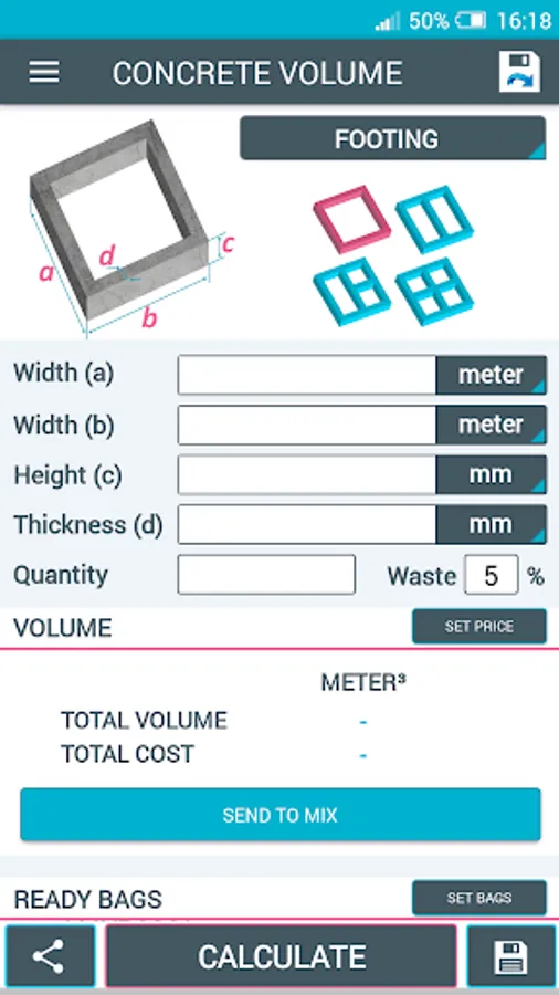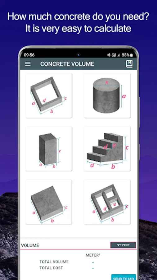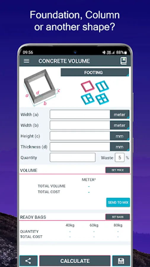 A simple tool to calculate how much concrete is needed for pouring slabs, footings, columns and steps.