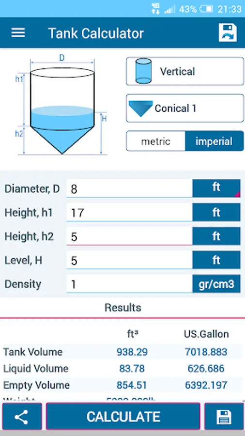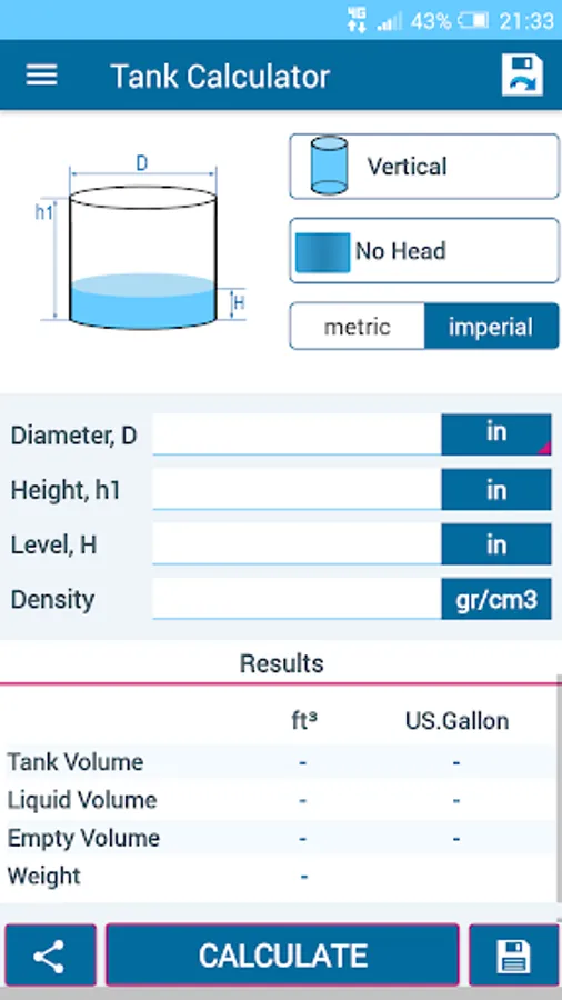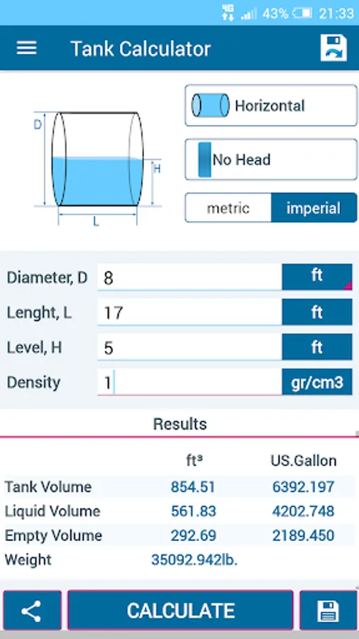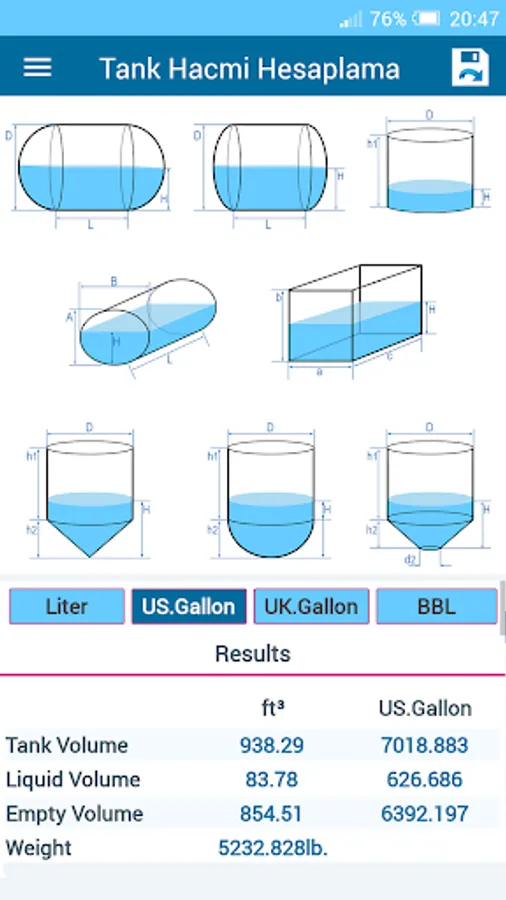 Tank Volume Calculator is a fast and simple app for calculating volume of tanks. Also you can calculate liquid volume in a tank. İf you know density of liquid you can calculate weight of liquid too