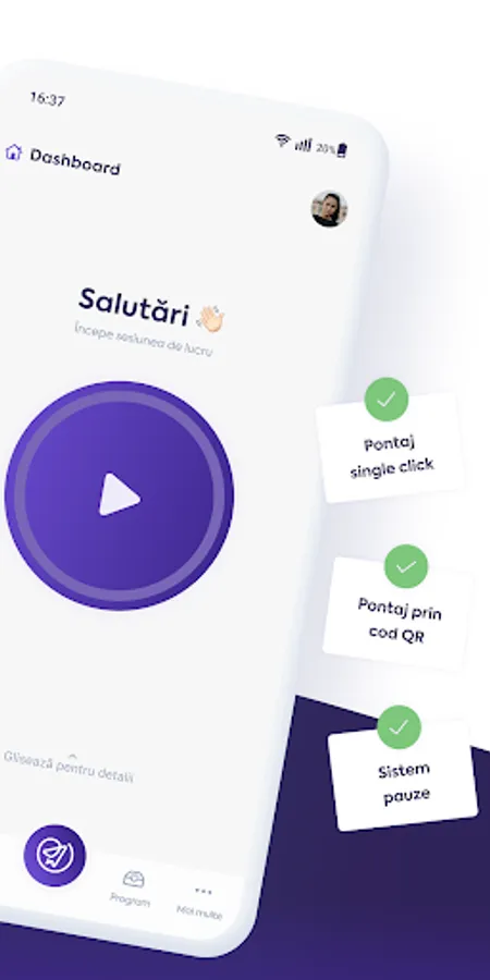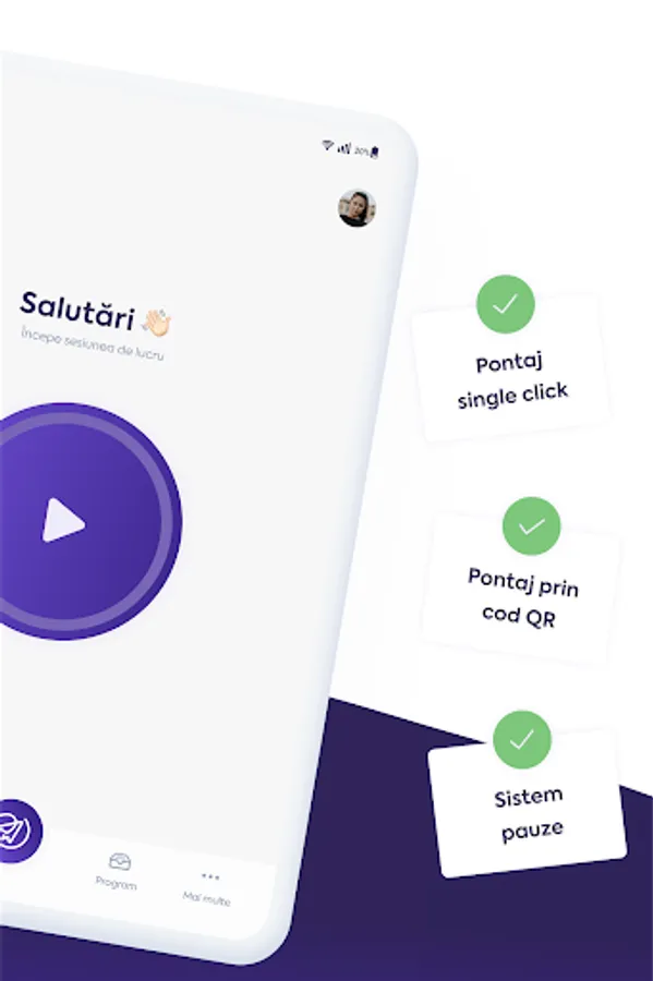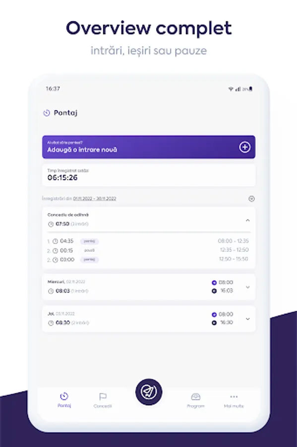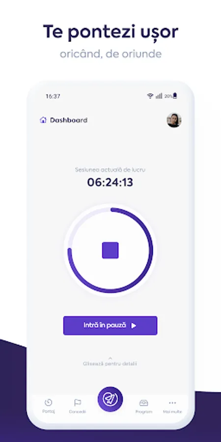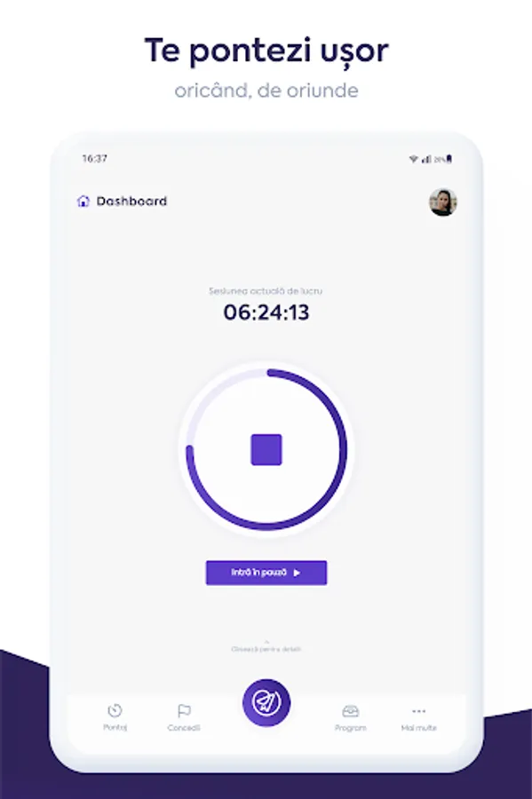 Timekeeping module with one-touch timekeeping, QR code timekeeping and break system - easily check your time and manage time spent at work;
