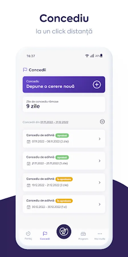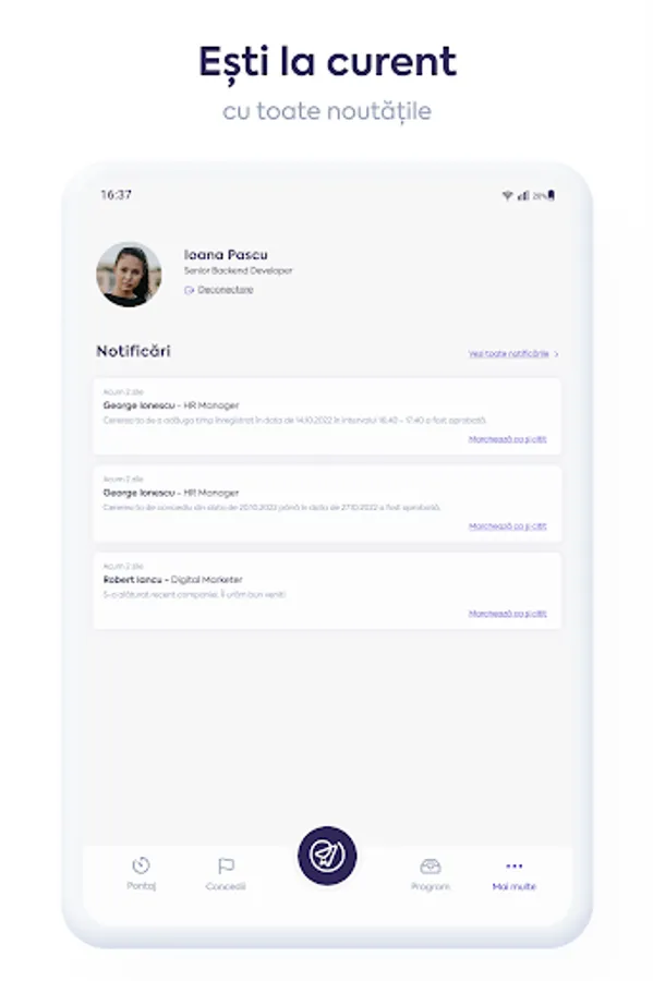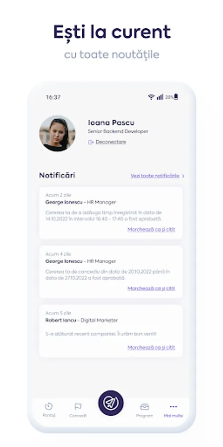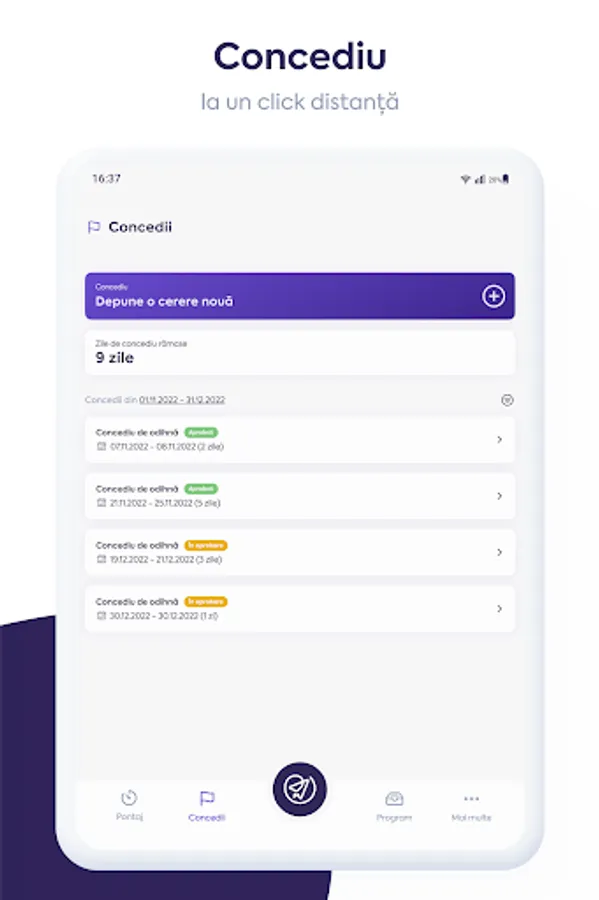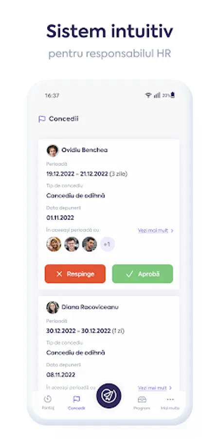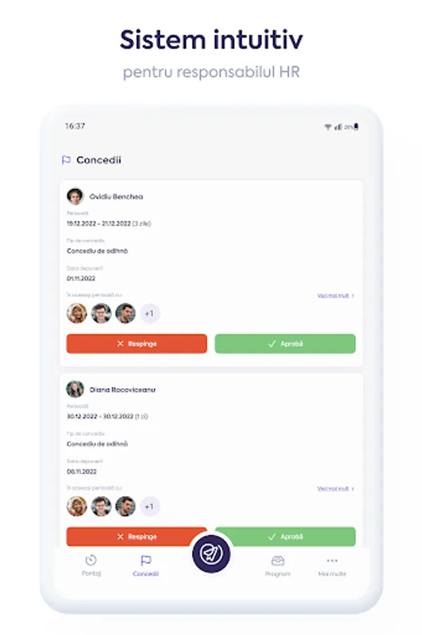 Leave module, with request and approval flows - send, approve or reject requests with a simple tap;