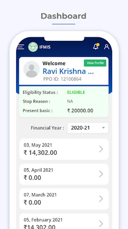 This application allows the pensioner to log in via multiple options including PPO ID entry and Bank details entry (salary bank account number and bank IFSC code). This ensures that all registered pensioners are eligible to use the IFMIS Pensioners App with information that is already available to them. Two-factor authentication in the form of mobile phone entry and OTP login ensures maximum data security.