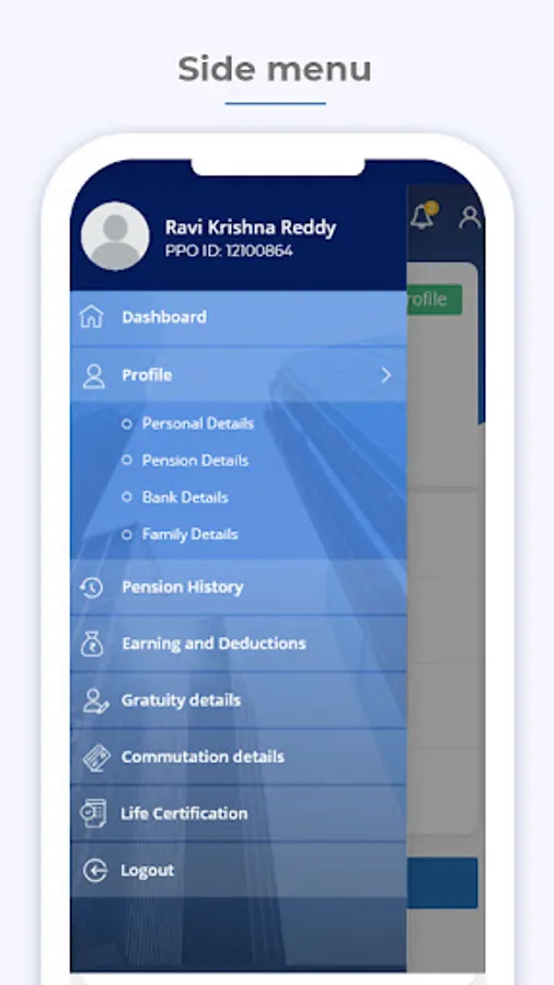 The Side Menu Bar of the IFMIS Pensioner’s App includes accessibility functions to visit important pages such as Profile ( Personal Details, Pension Details, Bank Details, Family Details), Pension History, Earnings and Deductions, Gratuity Details, Commutation Details, etc.