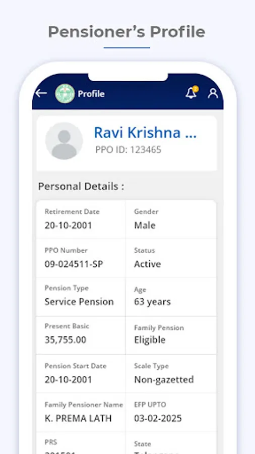 Pensioners can view the Pension Profile page that displays personal details of the Pensioner such as Retirement Date, Age , PPO Number, Pension Type, Present Basic, Pension Start Date, Family Pensioner Name, Pensioner Scale type and EPF Upto Date.