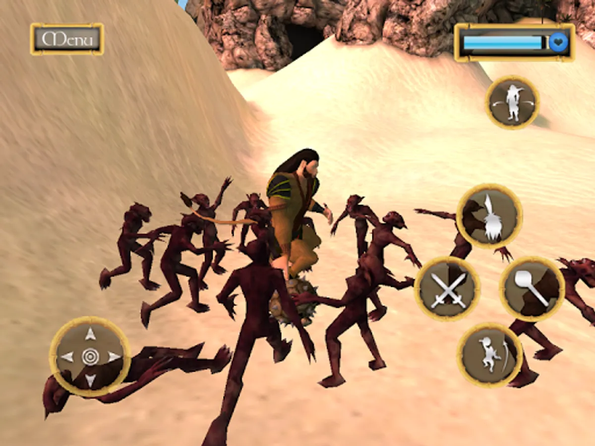 Run Hanuman to the speed of sound and learn to fly over the Indian Ocean, using gyroscopic controls or a thumb-controlled joystick. Slide down Simhika's gullet, avoiding internal spikes, and then use his giant gada to fight his way out of Simhika's belly. Fight more than 50 demons on the island of Lanka, before bringing the demigod Lankini to her knees. Finally find Sita. Give her Ram's ring and lift her spirits with Ram's Story and a song.
