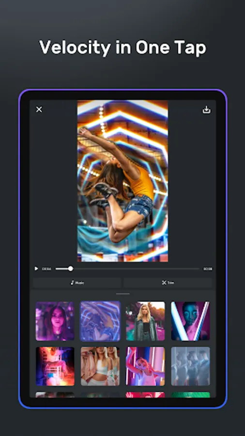 With Velomingo Velocity Edit Maker, you don’t need to create the whole edit from scratch. You only need to select the velocity template you like out of hundreds of velocity templates and add the media and music. The rest is done by Velomingo and you have a cool velocity edit! Share the edit on your social media and make your followers wonder how you got those editing skills.