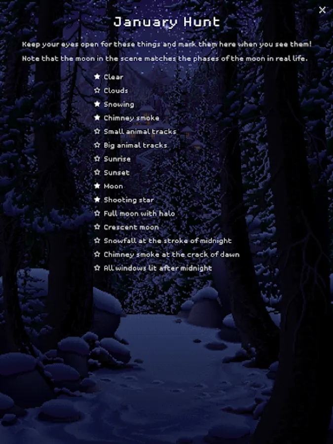 This release of the app contains all twelve of the original scenes in their full glory. The sun rises and falls in real time, storms pass through, flowers bloom, the moon and stars cross the sky. Smaller details like chimney smoke and animal footprints come and go. The image "lives" throughout the day, drawing you in, suggesting stories, and rewarding quiet observation.