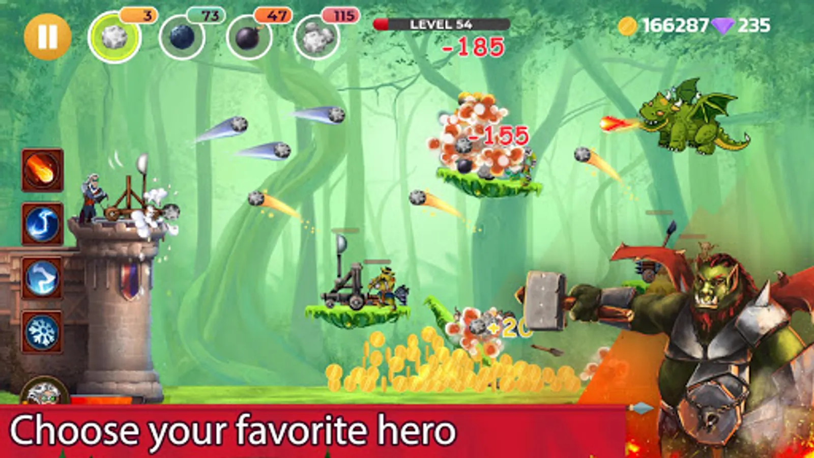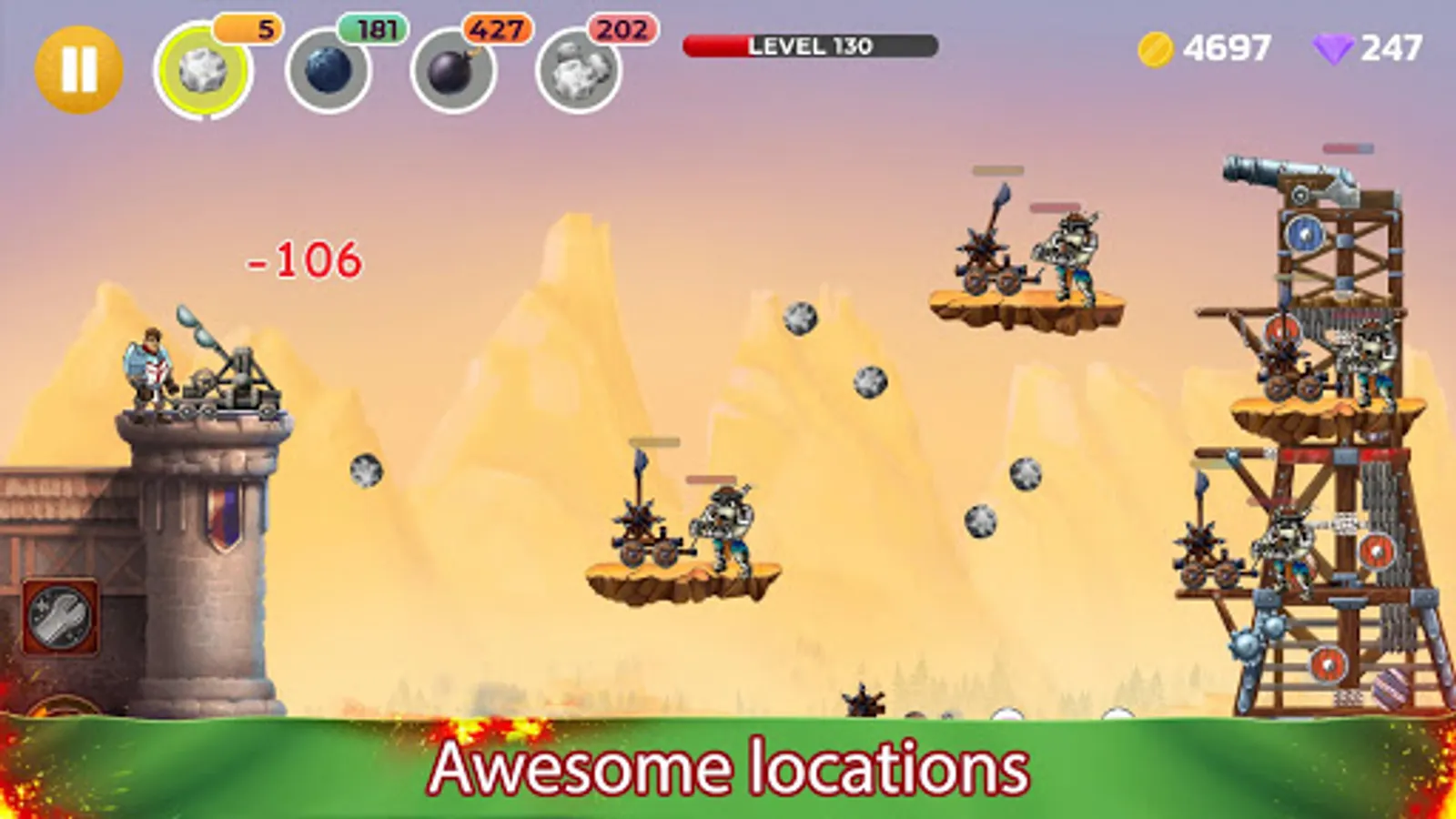 Get awards for an excellent work done and improve your catapult. Every destroyed hostile catapult will let you earn coins, which can be spent on upgrades for the catapult, on purchasing of a hero's armour, powerful shells etc.