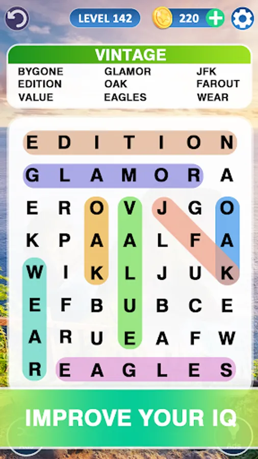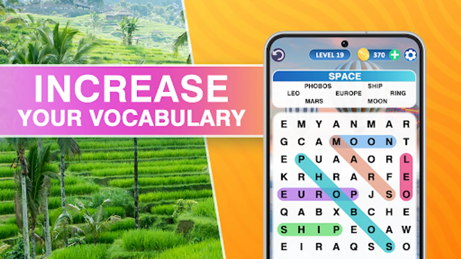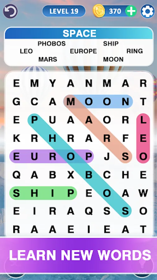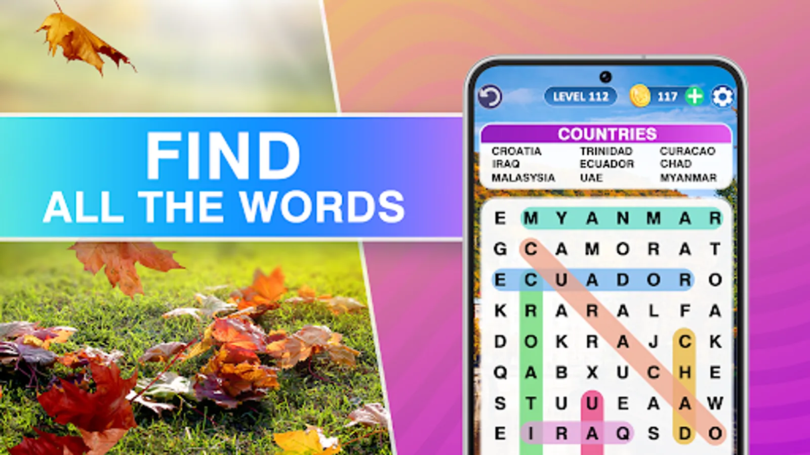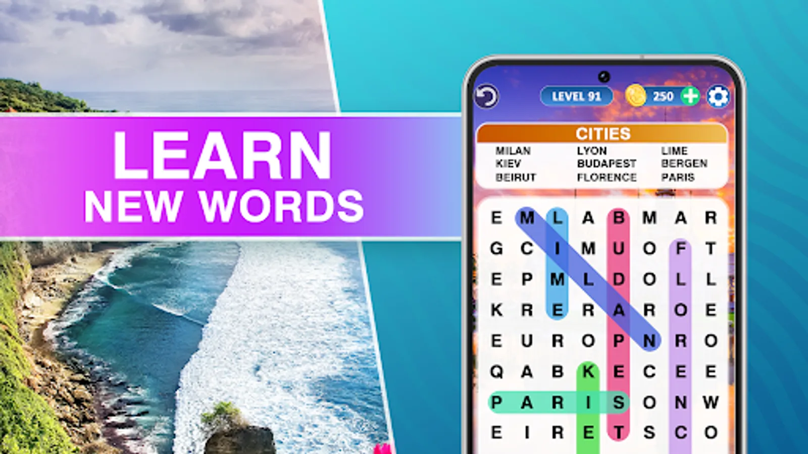 The game is very simple, you need to look for words on the playing field by swiping the screen up, down, left, right or across the diagonal. With each passing level your vocabulary will expand. The game will be a wonderful anti-stress after a long day of work with the help of relaxing backgrounds and beautiful scenery, which we have chosen for you.