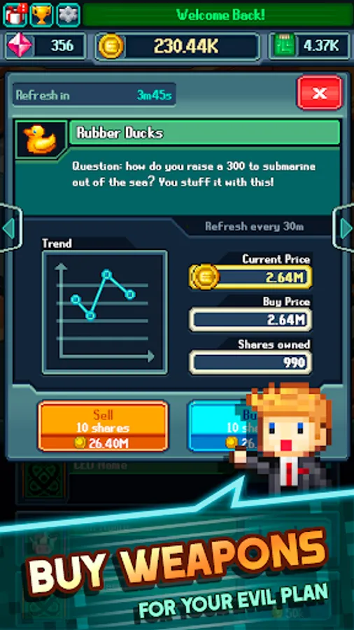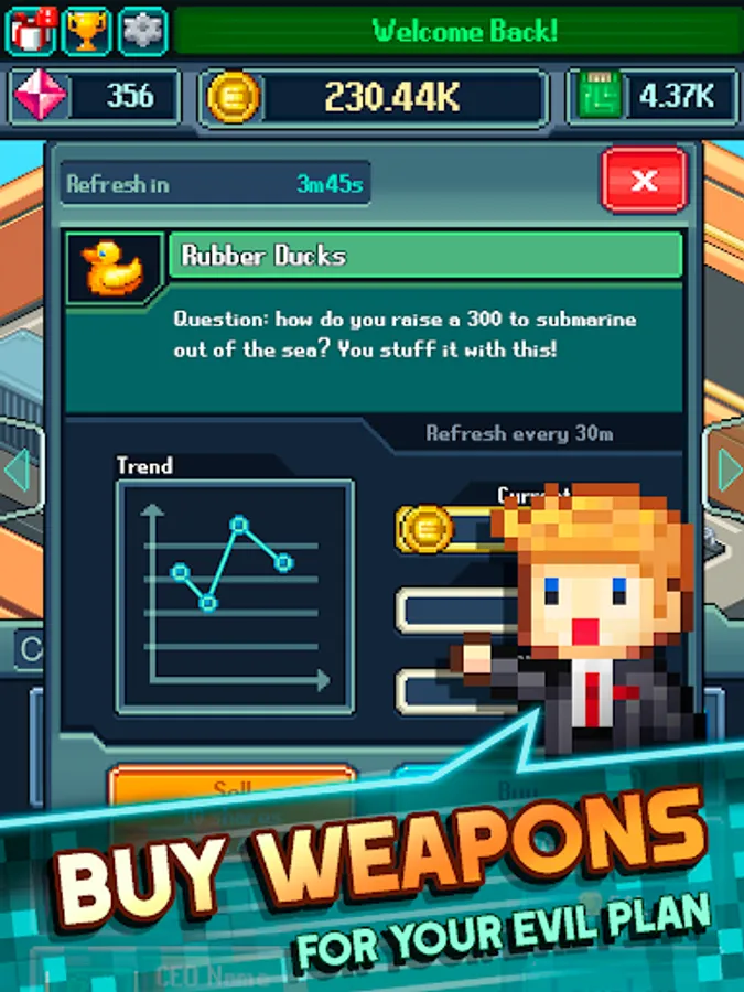 Using your knowledge as a business tycoon, you’ll have to invest and trade in questionable businesses and resources on the black market to make your evil quest a profitable one. View charts to predict the markets, get your henchmen to trade for you and – hopefully – make another trillion dollars! As you grow you’ll get fans and receive free gifts as a reward for being so damn evil!
