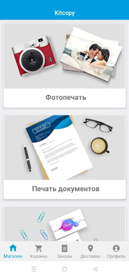 To place an order, you need to select the category and service you are interested in, upload photos (files) and add a comment, and then log in by phone number and select the point of issue of the order. Everything, the order is placed! When it is ready, you will receive a notification directly in our application.