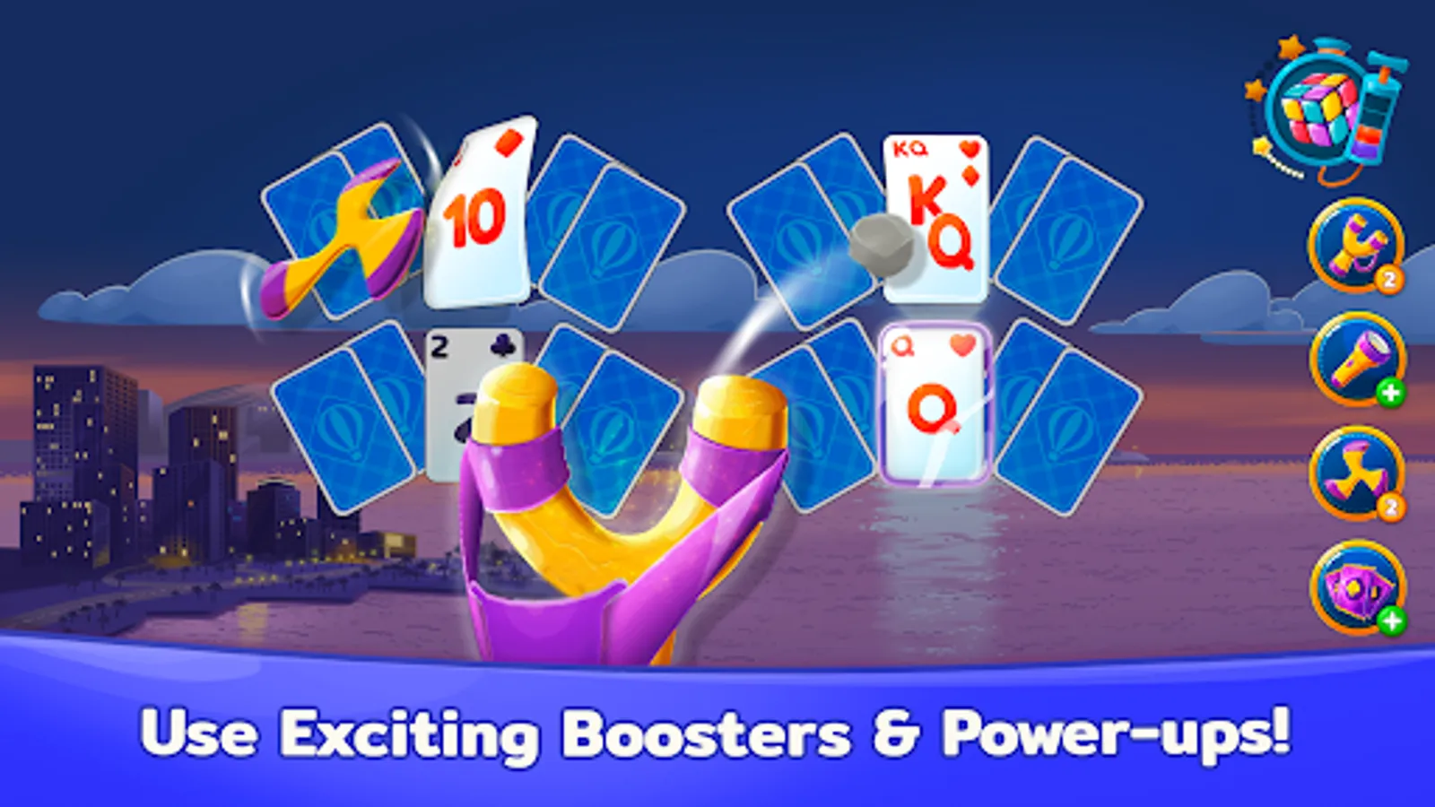♣️ Use powerful Power-ups like Slingshots and Boomerangs to pass even the most challenging solitaire levels.