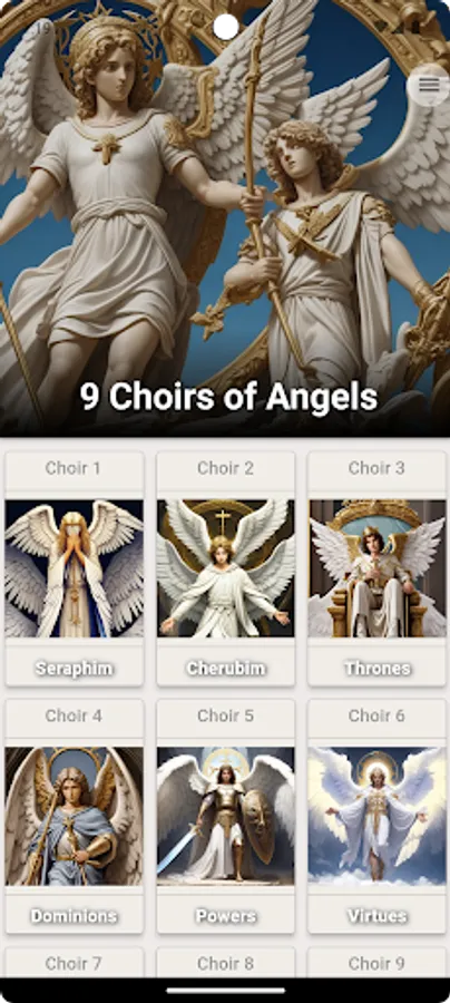 The Nine Choirs of Angels, are hierarchical orders or choirs of angels in heaven. These choirs are grouped into three spheres, each consisting of three choirs, based on their proximity to God and their assigned duties.
