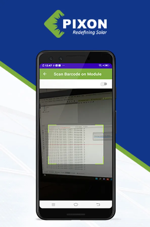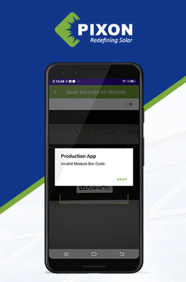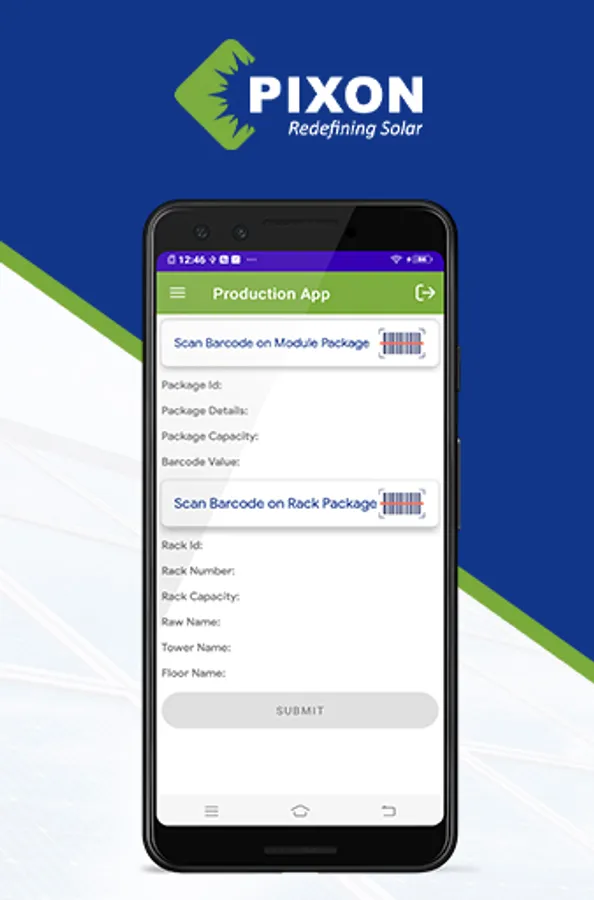 The application made for Production Staff For Pixon Green Enery Pvt.Ltd. Using this app User have to scan the Barcode on the Module and Rack to assign Module to the Rack.