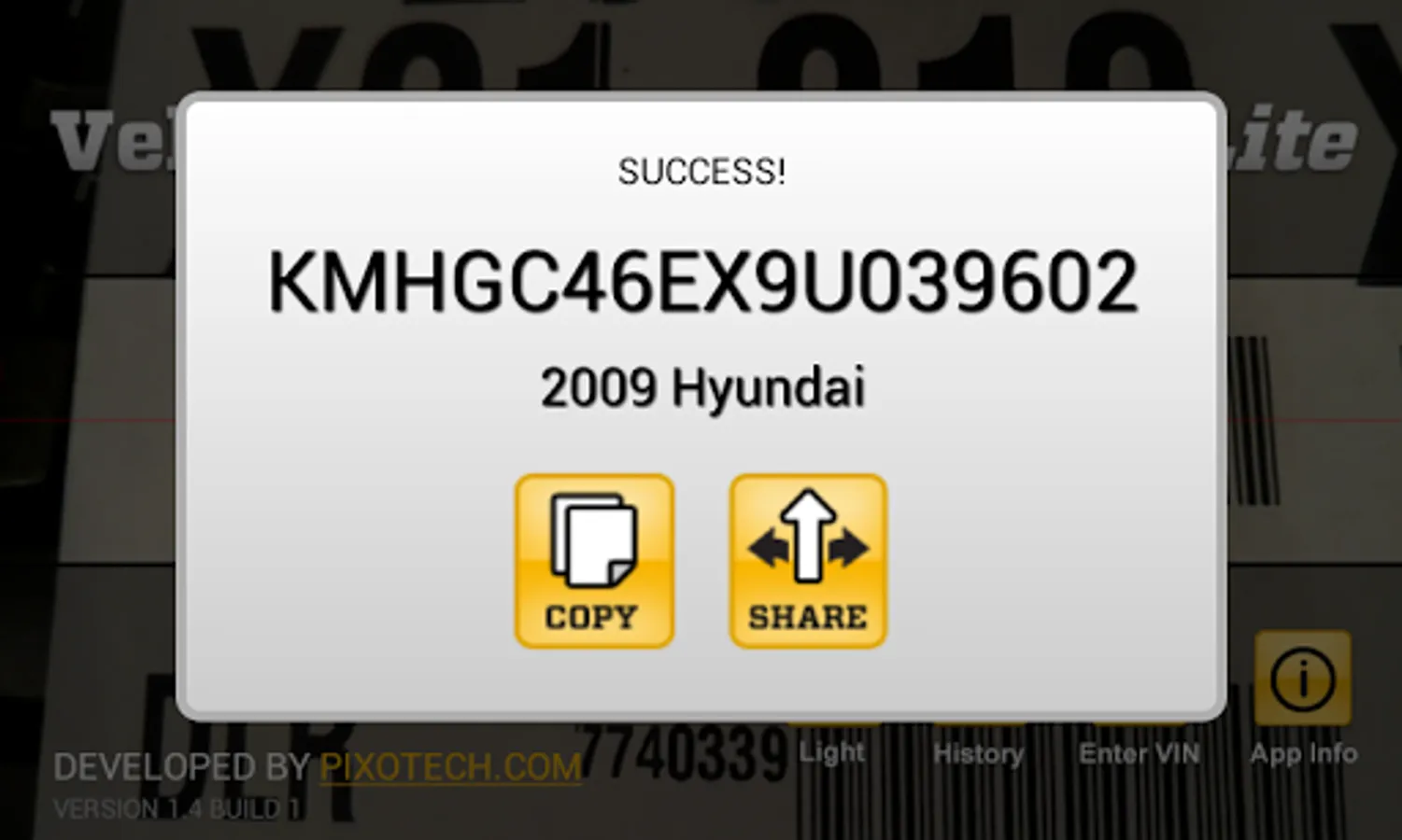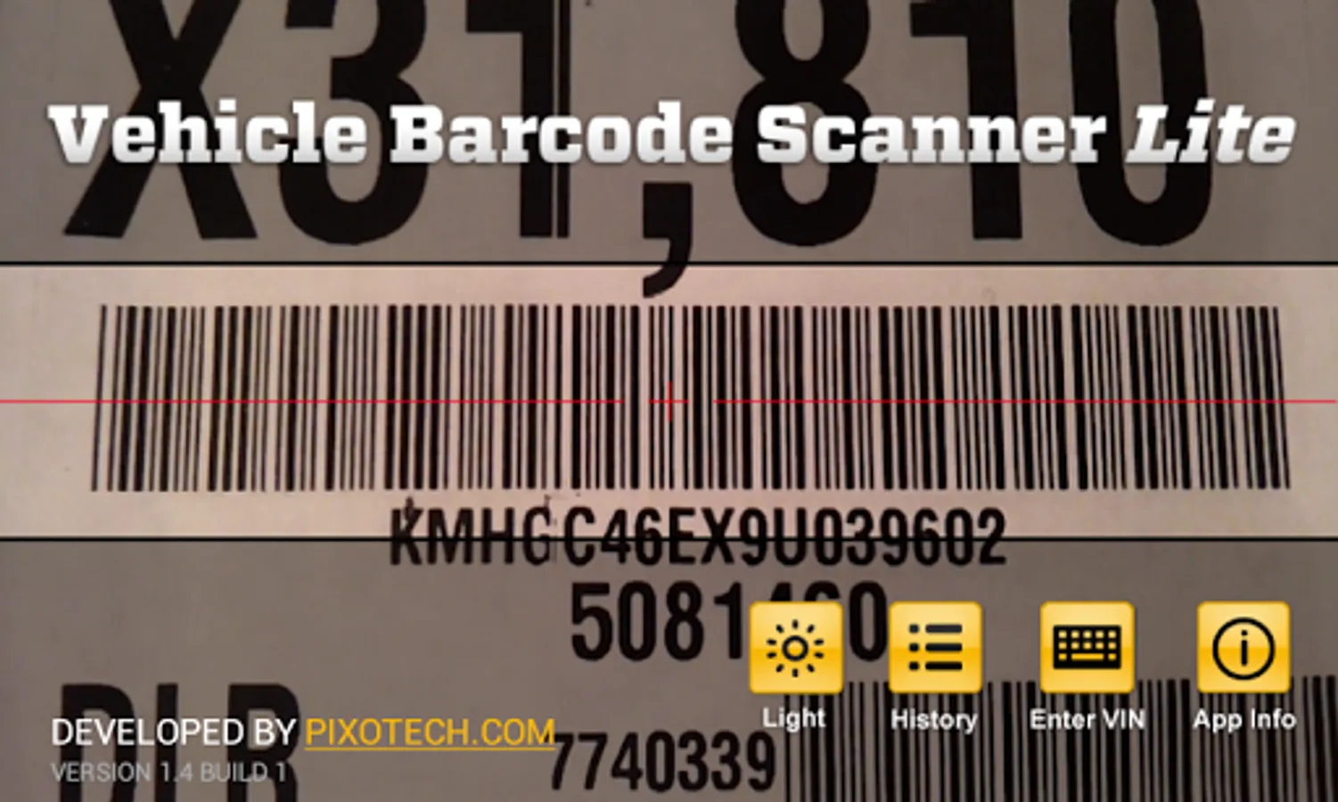 Pixo's Vehicle VIN Barcode Scanner LITE is uniquely optimized to accurately scan linear VIN barcodes — including through windshield glare and in a variety of indoor/outdoor lighting situations. Upgrade to our Fleet application (https://play.google.com/store/apps/details?id=com.pixotech.pixoVIN) for additional features.