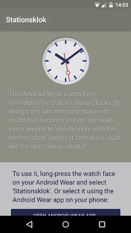 To use this watch face, long-press the background on your Android Wear and select 'Stationsklok'. Or select it using the Android Wear app on your phone.