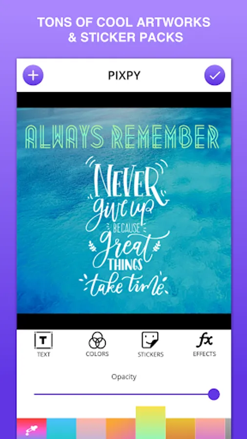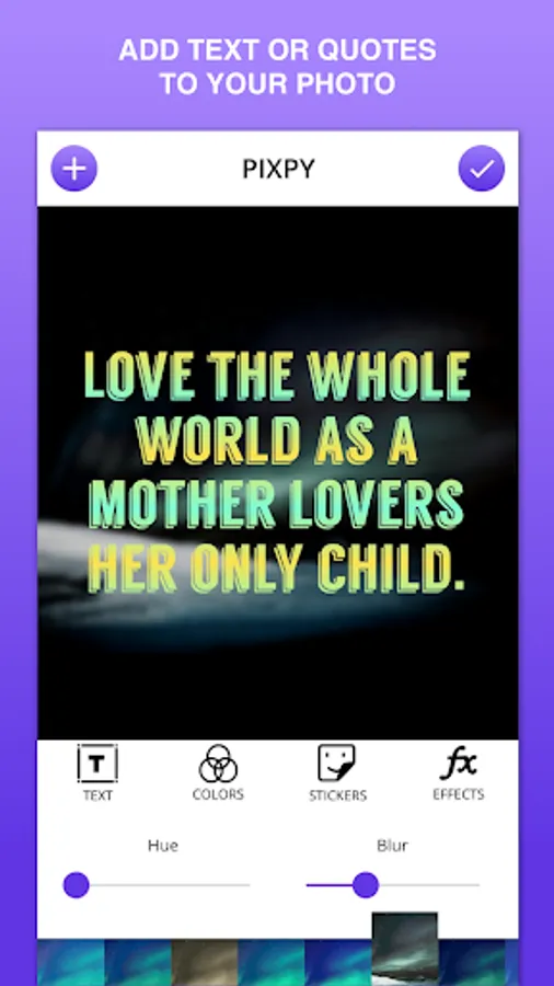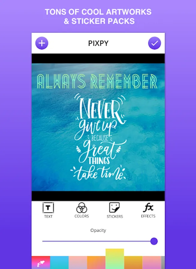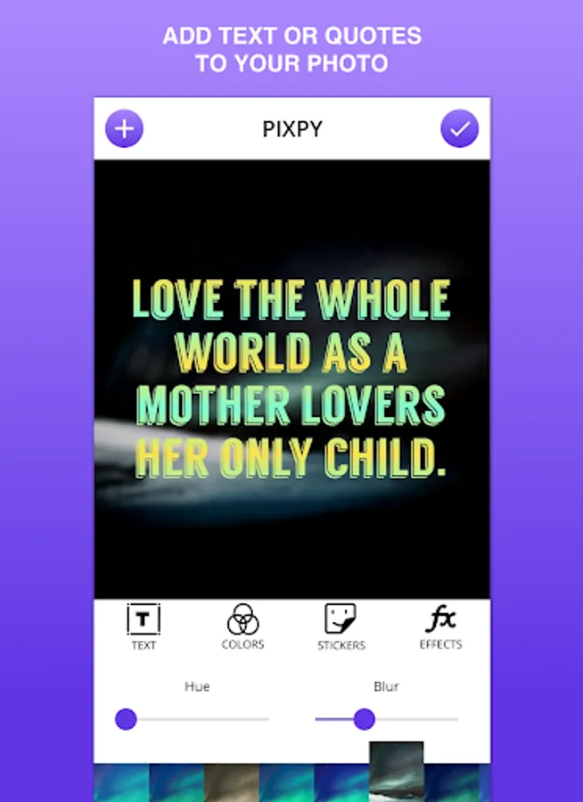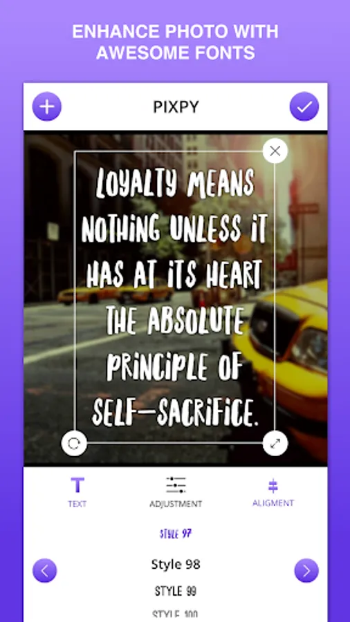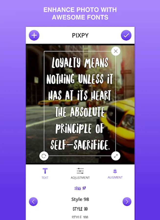PIXPY instantly get your text beautifully laid out on a background of your choice with just few taps. Adding text with PIXPY would not take much of your time in compare to Photoshop or a similar photo editor.