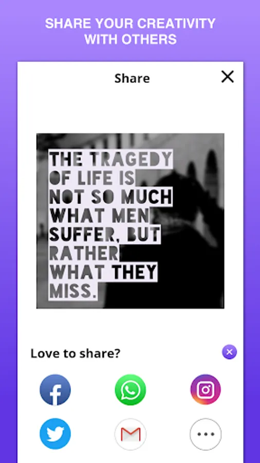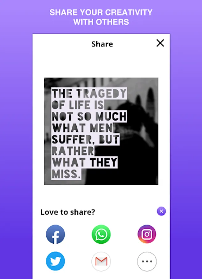 Add amazing quotes, artwork, filters, colors, gradients and you can easily share them to Instagram, Facebook whats app etc.