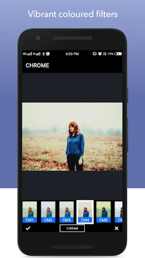 Fully-adjustable filters across five categories like BW Dark, Clean, Chrome, Fade, Vivid Colors, Classic, Lomography, Old Film, Vintage, Splash Art, Polaroid, Season and more. Choose the appropriate category of filter & enjoy its wide varieties of filters.
