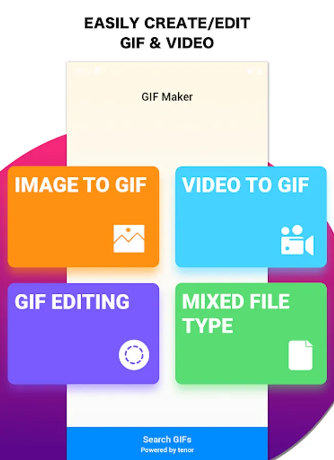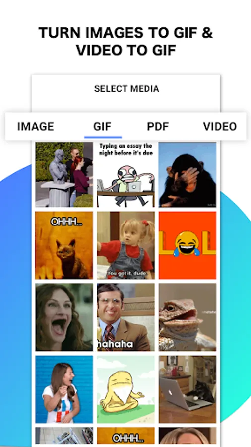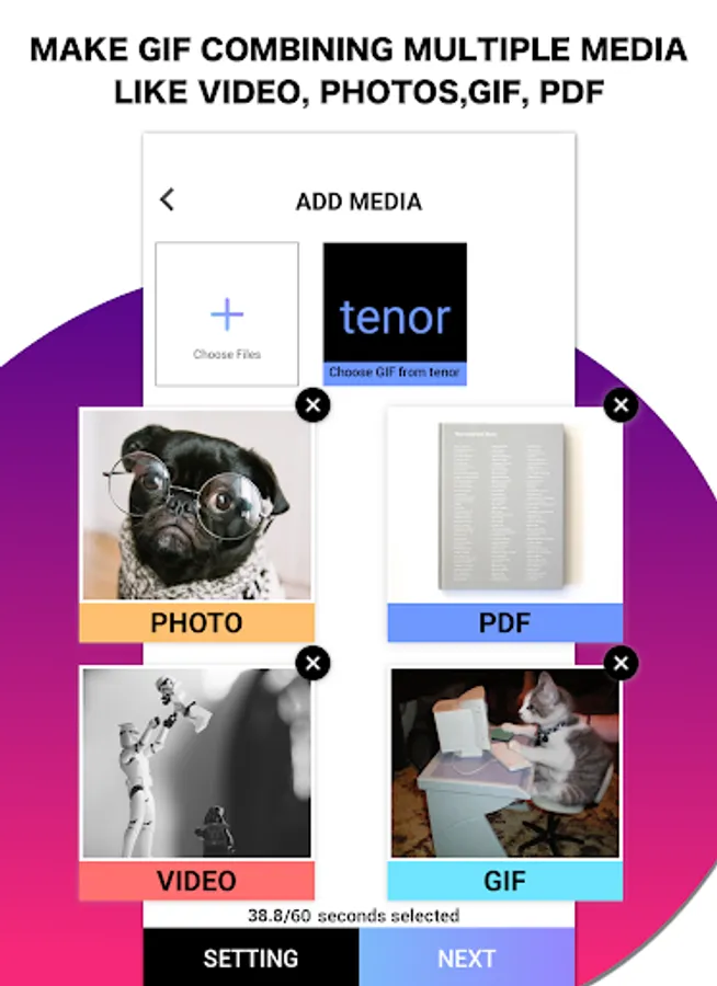 Choose multiple file types like photo, video, gif, pdf and convert them in to one GIF/Video.
