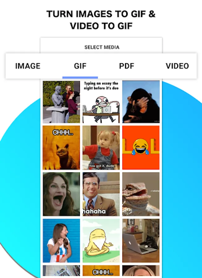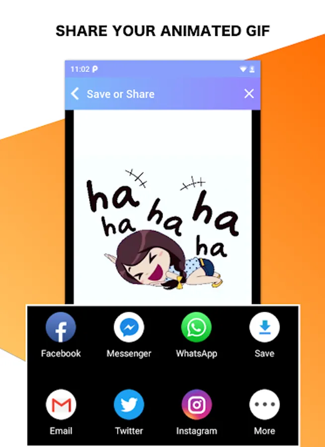 You can make all kinds of GIFs, such as loop GIFs, reaction GIFs, and funny GIFs and then share them to WhatsApp, Messenger, Facebook, Twitter, Instagram, Tumblr, GIPPHY, IMGUR and other apps with just one click.