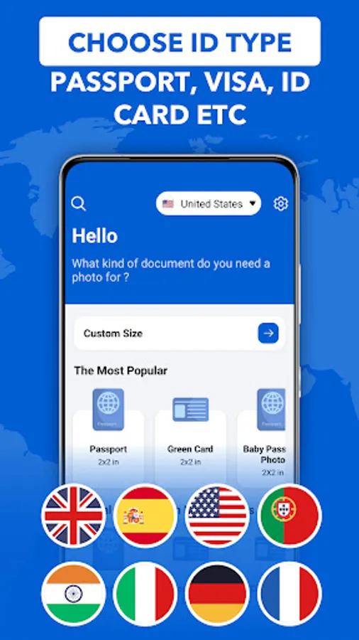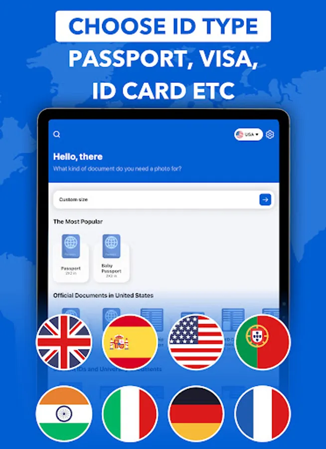 The Passport ID Photo Maker App already provides passport photo templates for the following countries: USA, India, UK, France, Germany, Italy, Spain, Brazil, and Portugal.