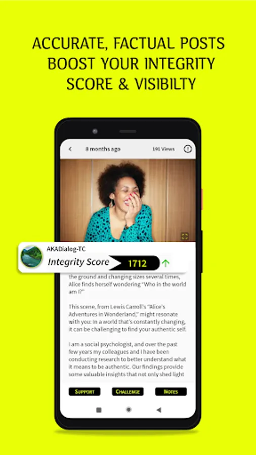 True, factual posts boost your Integrity Score. With a high enough score, members can earn badges and higher visibility. Untrue, indecent or hateful posts lower a user’s score, and can lead to the user being banned.