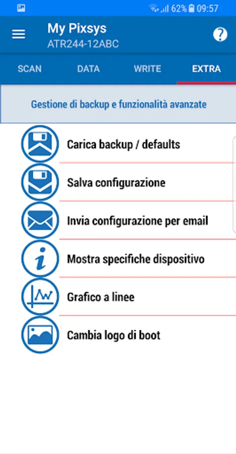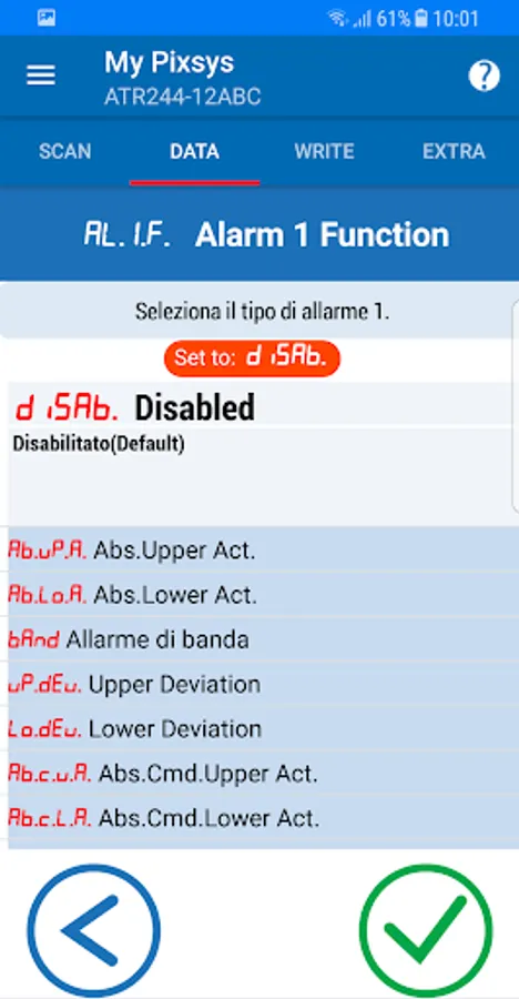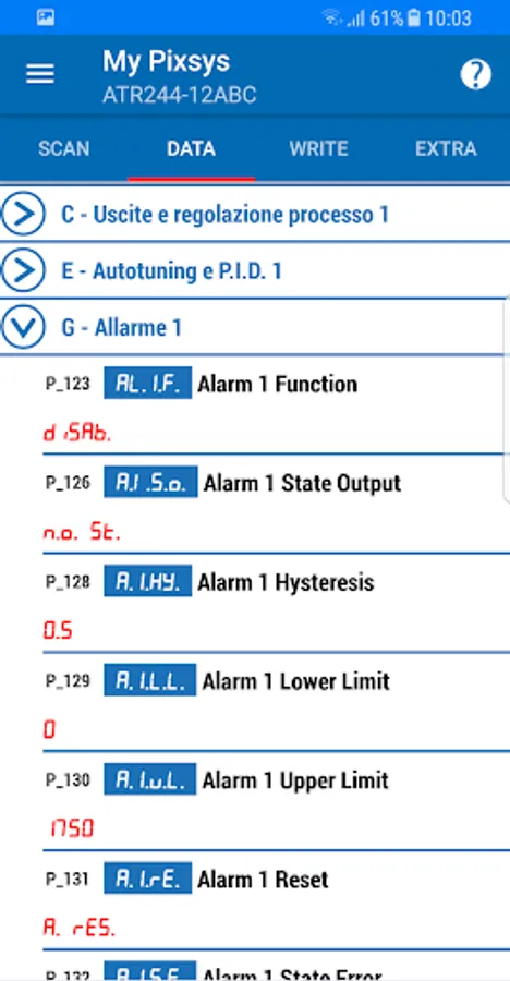 Each group can be expanded in a list and contains the values that regulate the functioning of your Pixsys instrument. Touch any row to edit the corresponding parameter, and once done, write the new configuration your device.