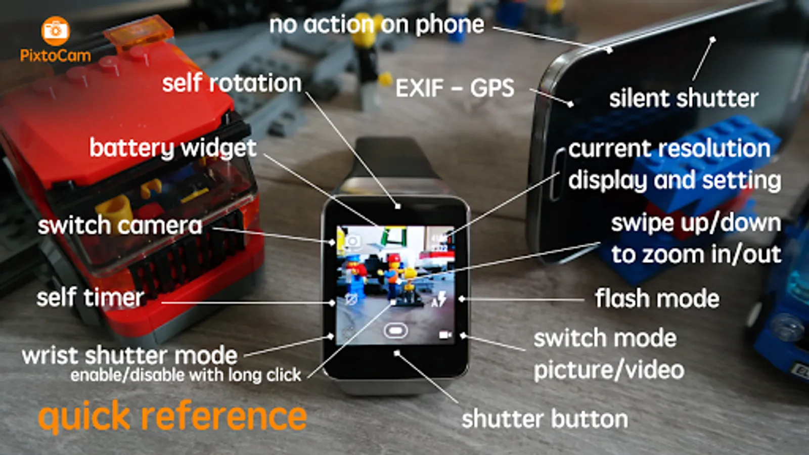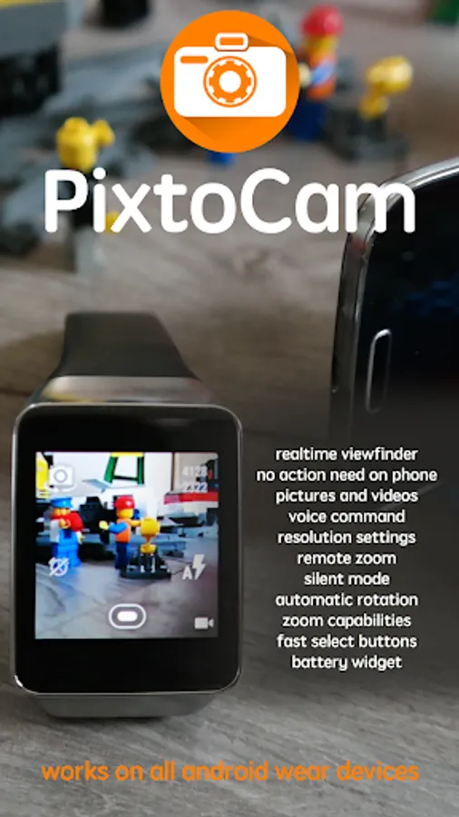 PixtoCam allows you to view and control camera from your watch to take pictures or make videos : a viewfinder. Don't matter if your phone is on or off just launch PixtoCam on your Wear OS Watch ("start viewfinder") and get a realtime preview. You can select the front or rear camera, choose resolution, zoom in and out, use a self-timer, adjust the flash setting, use torch in video mode and more.