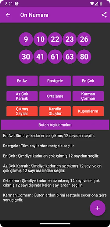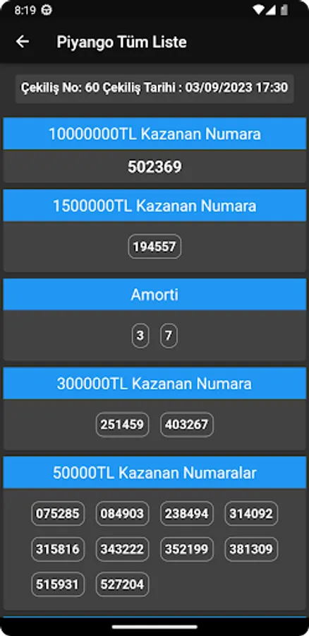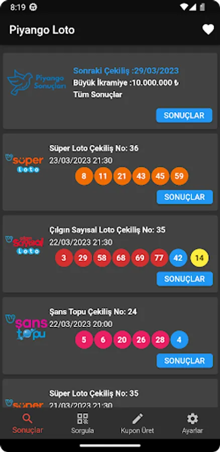 With PiyangoLoto, you can instantly learn the results of the National Lottery, Numerical Lotto, Lucky Ball, Number Ten, Super Lotto with a notification sent to your phone as soon as they are announced. You can access the lottery results by scanning the QR code. You can also access lottery videos with the application. With daily notifications, all lottery results are sent to your phone just in time. You can check your ticket from the National Lottery full list or enter the ticket number to reach the results. The National Lottery is automatically queried with your ticket number and the result is shown to you. By scanning the QR code or manually entering the ticket number, you can inquire about your tickets, find out if you have won and how much you have won. With the coupon creation section, you can make coupon estimates as you wish. When creating coupons, you can create coupons by choosing the most or the least popping. You can see all the numbers that have appeared in previous draws. The application can generate lottery predictions based on these analyzes and the resulting numbers. This feature can increase your chances of winning in games of chance.