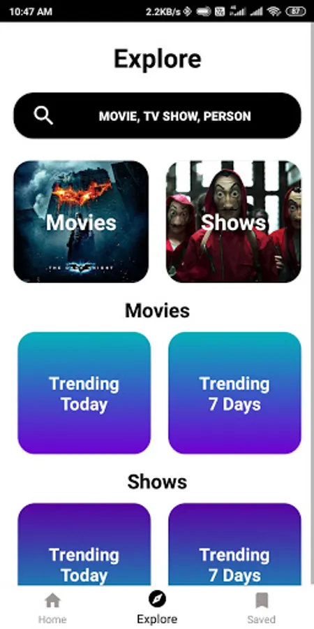 -> You can explore Movies & Shows by 4 categories each like Popular, Now showing , Top rated ,etc...