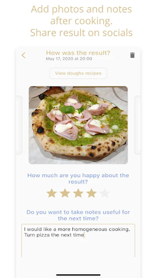 PizzAssistant will help you to keep track of your improvements day by day thanks the possibility to upload photos of your creations and save notes.