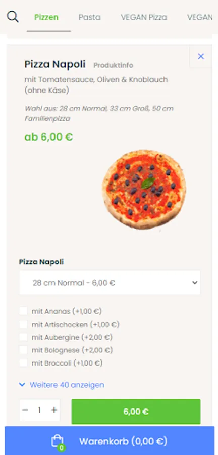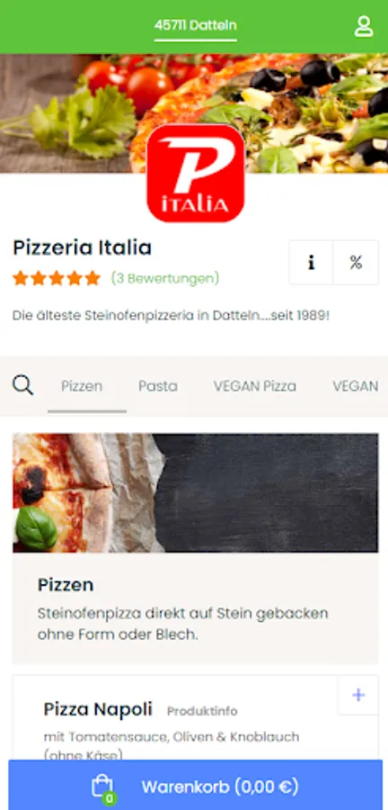 We have been in Datteln with the best stone oven pizza for over 33 years. With the new app, your favorite pizzeria is just a touch away. In addition, a large selection of delicious pasta dishes, crispy fresh salads, burgers, baguettes, schnitzel, finger foods, wraps, VEGAN pizzas & VEGAN pasta dishes.