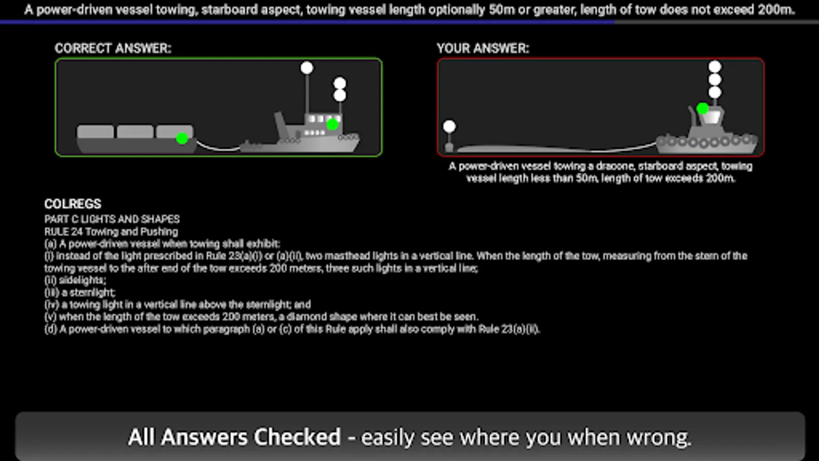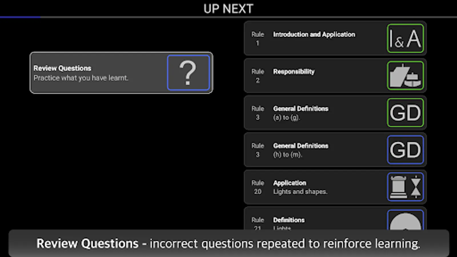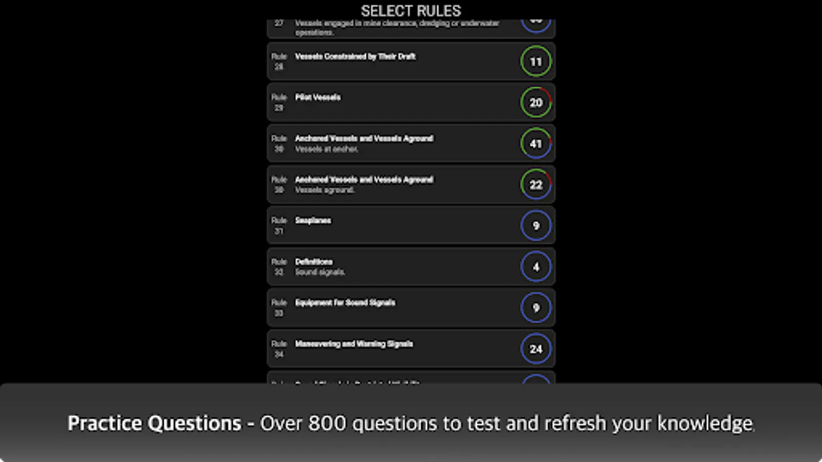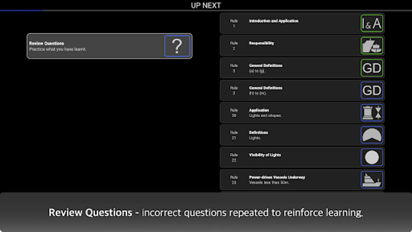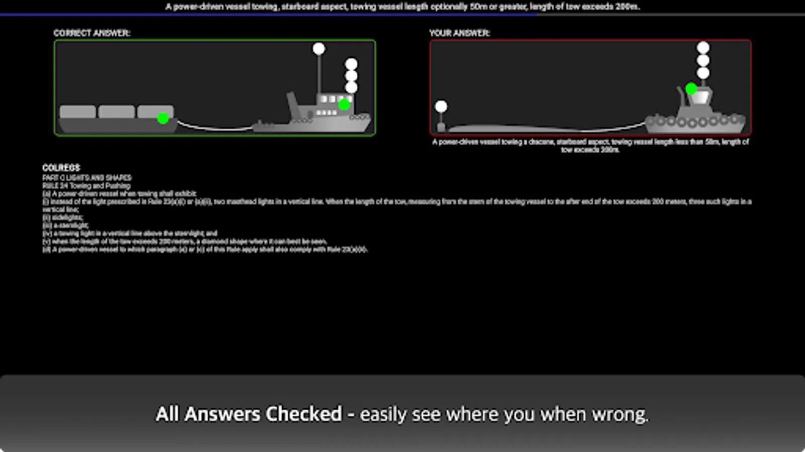 As you progress through the app, you'll encounter optional review questions to assess your understanding and ensure you have fully memorized the rules. With a vast array of over 790 questions in various formats, each accompanied by clear graphic answers highlighting your mistakes, Master-Nav reinforces your knowledge repeatedly, making it effortless to memorize and refresh the rules.