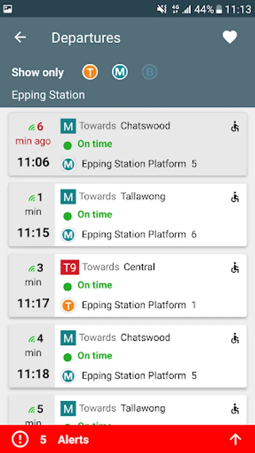 Departure Now shows you a list of services leaving next from your selected stop/station/wharf along with list of any alerts.